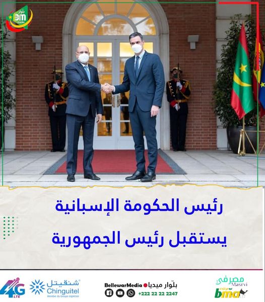 أجرى رئيس الجمهورية السيد محمد ولد الشيخ الغزواني اليوم الخميس في مدريد، محادثات بمقر رئاسة الحكومة، مع رئيس الوزراء الإسباني السيد بيدرو سانشيز، حضر اللقاء كل من وزير الخارجية ومدير ديوان رئيس الجمهورية وسفيرنا في مدريد، ومن الجانب الإسباني، حضر كبار معاوني رئيس الحكومة وسفيرة إسبانيا لدى بلادنا.