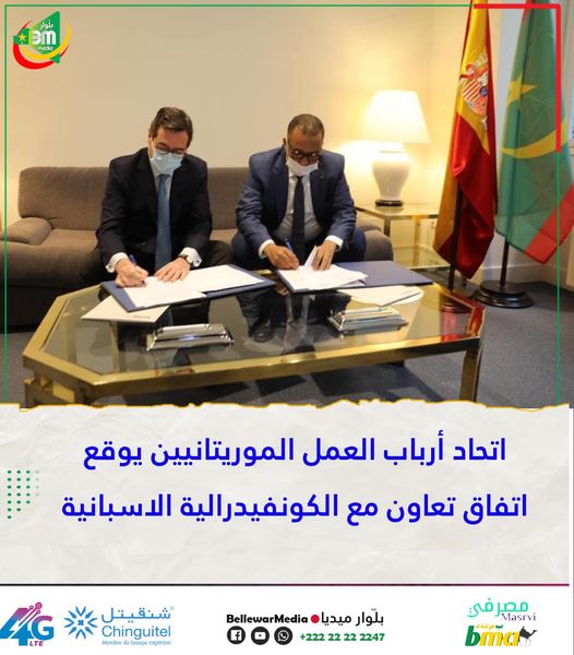 أشرف رئيس اتحاد ارباب العمل الموريتانيين السيد محمد زين العابدين ولد الشيخ احمد اليوم بمدريد على توقيع اتفاقية تعاون وشراكة مع الكونفيدرالية الاسبانية لمنظمات ارباب العمل