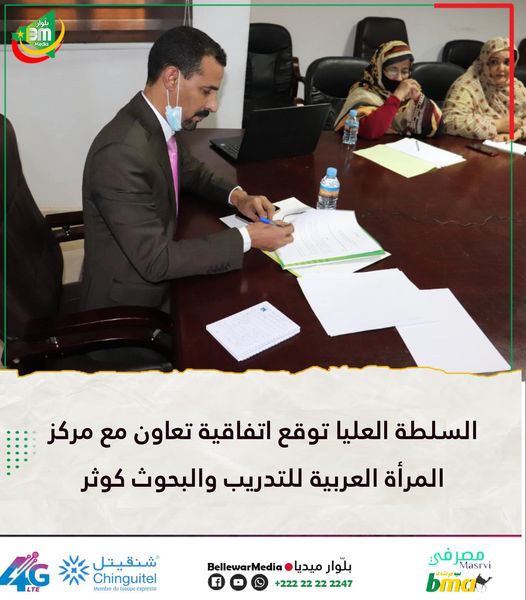 أشرف رئيس السلطة العليا للصحافة والسمعيات البصرية السيد الحسين ولد مدو اليوم الثلاثاء عبر تقنية الفيديو كونفيرانس الي جانب د. سكينة بوراوي المديرة التنفيذية لمركز كوثر على توقيع اتفاقية تعاون وبرنامج تنفيذي بين السلطة العليا ومركز المرأة العربية للتدريب والبحوث كوثر .