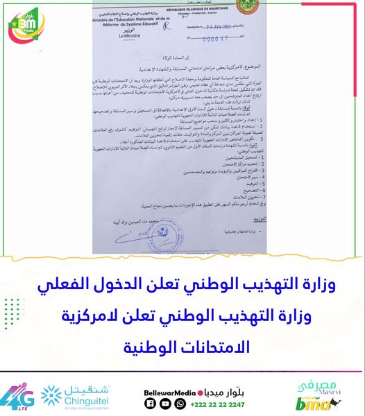 أصدرت وزارة التهذيب الوطني وإصلاح النظام التعليمي تعميما وقعه الوزير محمد ماء العينين ولد بيه يكليف الإدارات الجهوية بإجراءات جديدة ضمن سياسة لا مركزية الامتحانات والمسابقات.