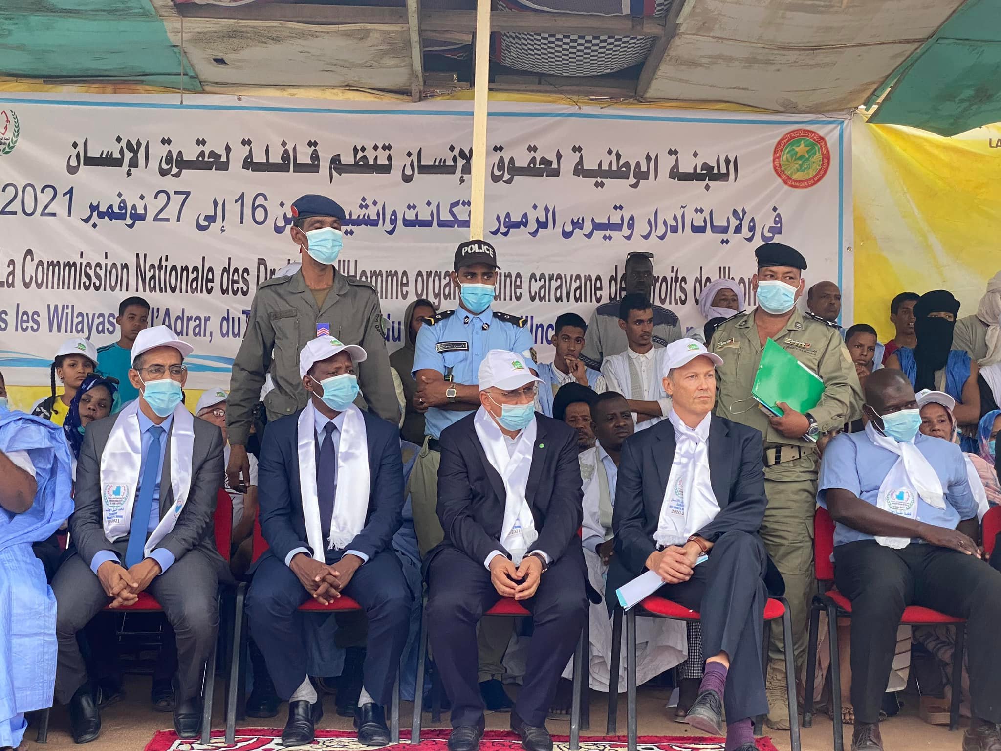 وقد تم حفل اطلاق القافلة بحضور والي آدرار وحاكم المقاطعة وعمدة البلدية وأعضاء اللجنة الوطنية لحقوق الإنسان وسفير الإتحاد الأوروبي وممثل سفير الولايات المتحدة وممثل مكتب مفوضية الأمم المتحدة السامية لحقوق الإنسان والأمين العام للجنة الوطنية لحقوق الإنسان وممثلو السلطات الأمنية والإدارية والقضائية والامين العام لمنظمةمنتدى المنظمات غير الحكومية في موريتانيا
