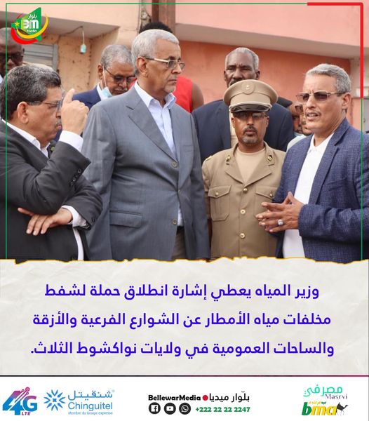 أعطى معالي الوزير السيد سيدي محمد ولد الطالب أعمر، مساء اليوم الثلاثاء من مقاطعة السبخة، إشارة انطلاق حملة لشفط مخلفات مياه الأمطار عن الشوارع الفرعية والأزقة والساحات العمومية في ولايات نواكشوط الثلاث.