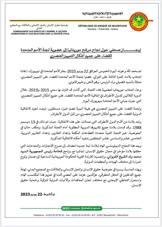 أعلنت مفوضية حقوق الإنسان، عن انتخاب موريتانيا للمرة الثالثة كعضو في لجنة الأمم المتحدة للقضاء على جميع أشكال التمييز العنصري، اليوم الخميس خلال الدورة الثلاثين للدول الأطراف في اتفاقية الأمم المتحدة للقضاء على التمييز العنصري، والتي جرت بمباني الأمم المتحدة بنيويورك.