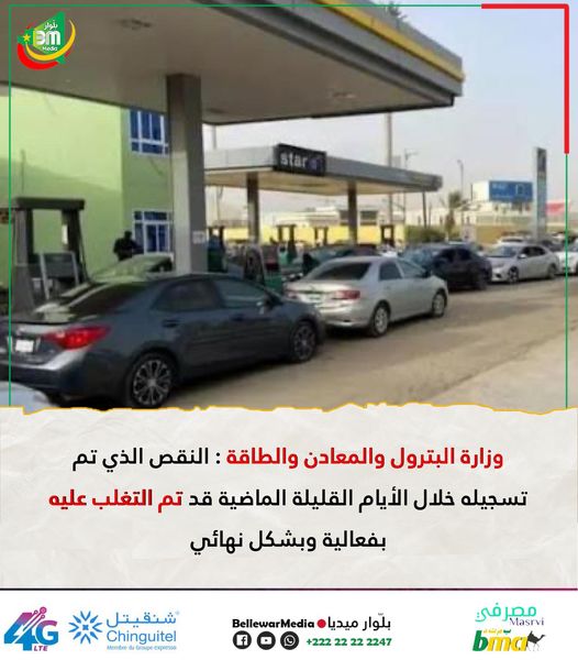 أكدت وزارة البترول والمعدن والطاقة على أن النقص الذي تم تسجيله خلال الأيام القليلة الماضية قد تم التغلب عليه بفعالية وبشكل نهائي حيث تم تزويد أكثر من 30 محطة على مستوى المقاطعات التسع لمدينة نواكشوط بمادة البنزين بما فيها تلك التي لم تسجل اي نقص.