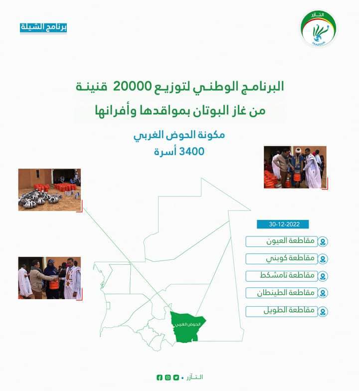 عموم ولايات البلاد، أطلقت اليوم المندوبية العامة للتضامن الوطني ومكافحة الإقصاء “التآزر” بمدينة العيون عملية توزيع الحصة المخصصة لولاية الحوض الغربي البالغة 3400 قنينة بأفرانها ومواقدها. وتأتي هذه العملية التي تشمل كافة مقاطعات الولاية: العيون، وكوبني، وتامشكط، والطينطان، والطويل على إثر عملية إطلاق مماثلة في العاصمة انواكشوط وأخرى في انواذيبو، وستتوسع إلى أن تشمل مختلف ولايات الوطن.