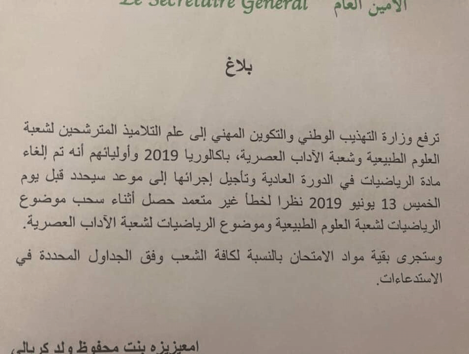 أعلنت وزارة التهذيب والتكوين المهني إلغاء مادة الرياضيات لشعبتي العلوم الطبيعية، والآداب العصرية، بعد حصول “خطإ في أثناء سحبهما”.