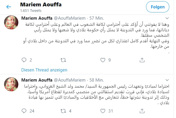 وأكدت بنت أوفى احترامها “لكافة الشعوب في العالم واحترامي لكافة دياناتها”، مشددة على أن ما “ورد في التدوينة لا يمثل رأي حكومة بلادي ولا شعبها ولا يمثل رأيي الشخصي مطلقا”.