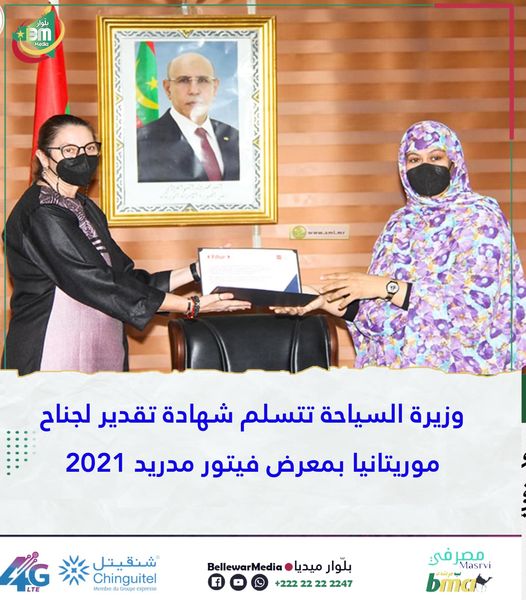 وسلمت الممثلة لمعالي الوزيرة شهادة تقدير لمورتانيا على مشاركتها في معرض فيتور 2021 بإسبانيا بوصف الجناح الموريتاني أكبر جناح إفريقي في المعرض وكان أكثر جناح زوارا نتيجة حسن التنظيم بإشراف المكتب الوطني للسياحة.
