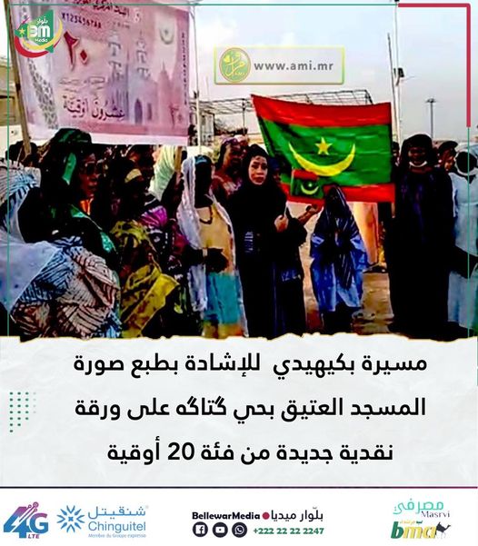 استقبل والي كوركول السيد أحمدنا ولد سيد أب، مساء أمس السبت أمام مباني الولاية مسيرة راجلة نظمها سكان مدينة كيهيدي للإشادة بظهور صورة المسجد العتيق بحي گتاگه على ورقة نقدية جديدة من فئة 20 أوقية.