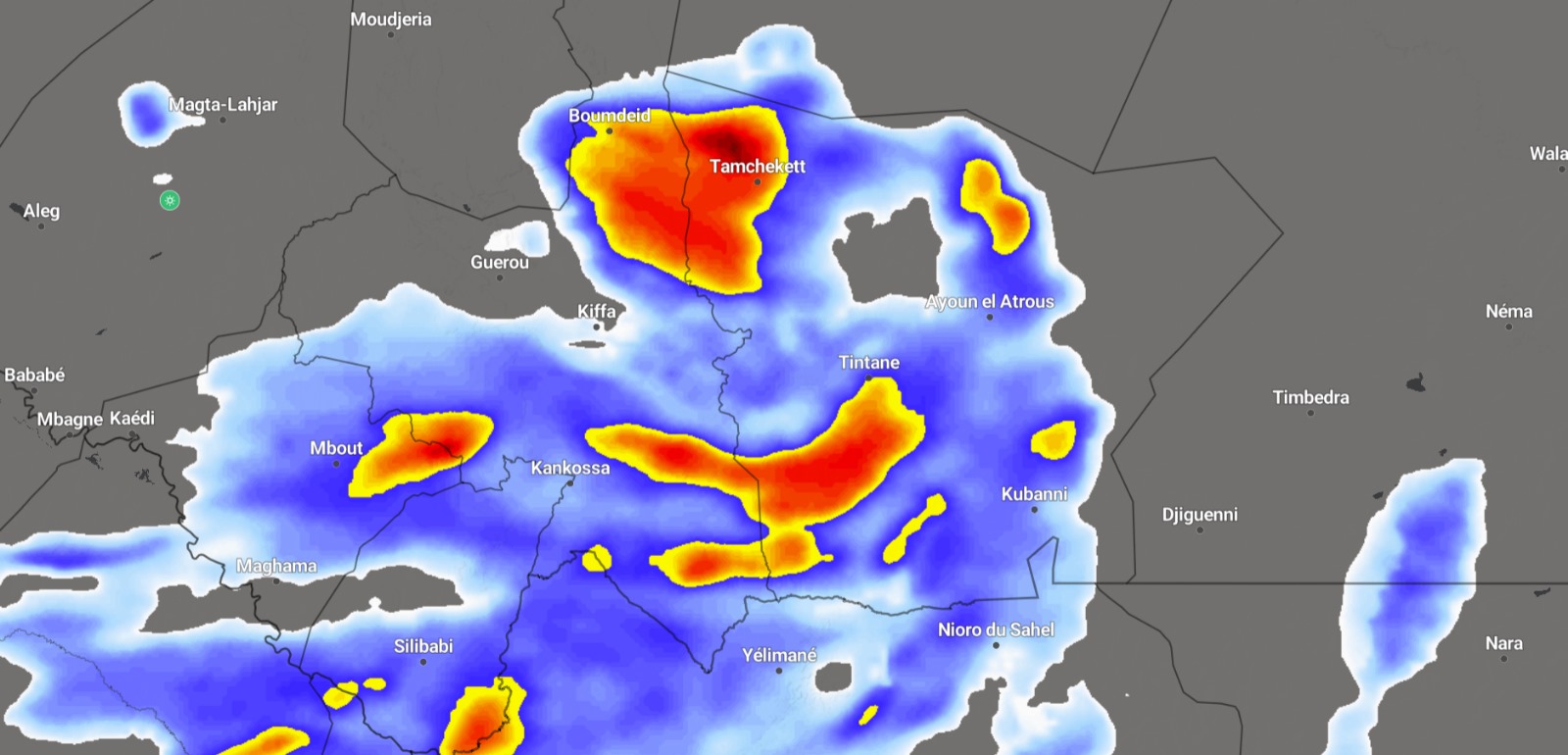 وتكاد السحب الماطرة تعم الآن (12:45) ولاية الحوض الغربي وتتركز الكثافة حول تامشكط وبومديد، كما تشمل جنوب الولاية، وهي سحب خفيفة إلى متوسطة لكنها مستمرة منذ ساعات طوال.