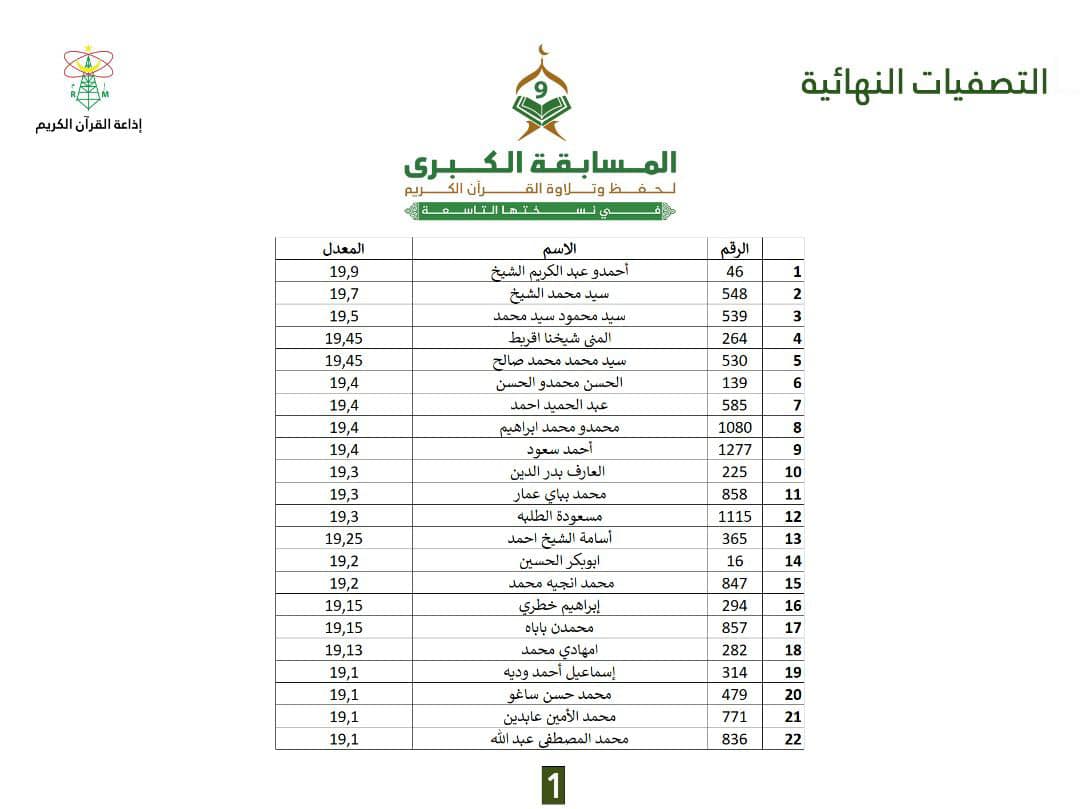 الإعلان عن النتائج النهائية للمسابقة الكبرى لحفظ وتلاوة القرآن الكريم النسخة التاسعة