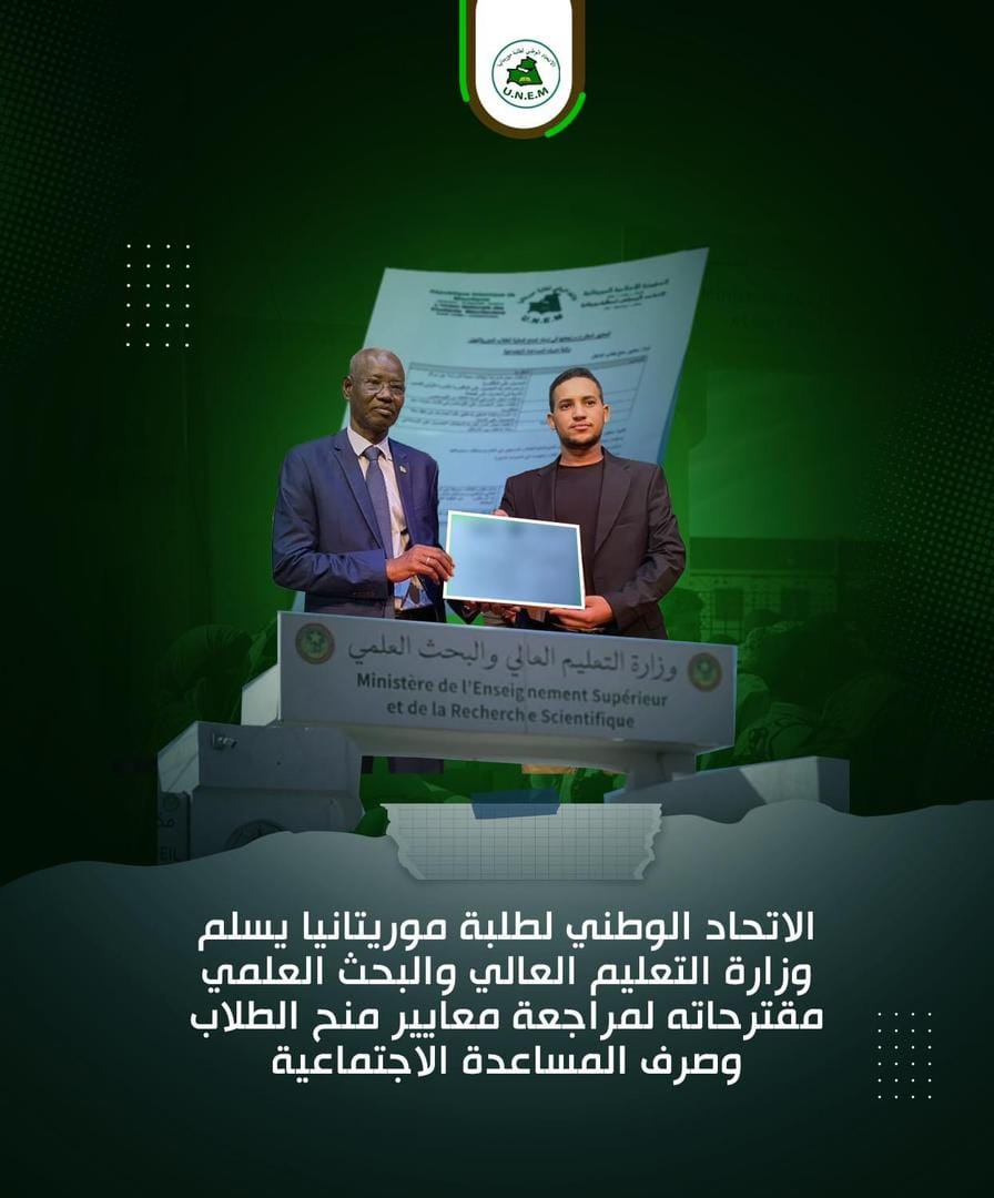 سلّم الأمين العام للاتحاد الوطني لطلبة موريتانيا محمد يحيى المصطفى وزير التعليم العالي انيانغ مامودو أمس الإثنين بمقر الوزارة مقترحات الاتحاد لمراجعة معايير إسناد منح الطلاب الموريتانيين في الداخل والخارج، وآليات ومحددات صرف المساعدة الاجتماعية للطلبة غير الممنوحين.