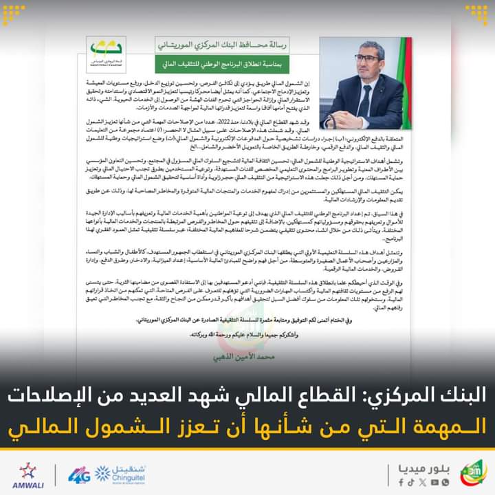 جاء ذلك في رسالة لمحافظ البنك المركزي الموريتاني، محمد الأمين الذهبي بمناسبة إطلاق البرنامج الوطني للتثقيف المالي.