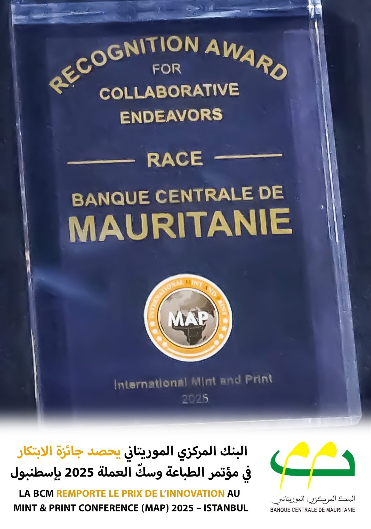 فاز البنك المركزي الموريتاني بجائزة الابتكار خلال مؤتمر الطباعة وسكّ العملة (MAP 2025) المنعقد في إسطنبول، تقديرًا لجهوده في تطوير المنظومة النقدية الوطنية. وتسلم الجائزة محافظ البنك، محمد الأمين الذهبي، بعد تقديم عرض حول نتائج إصدار تجريبي لورقة نقدية منخفضة الفئة صُنعت على عدة أنواع من الحوامل.