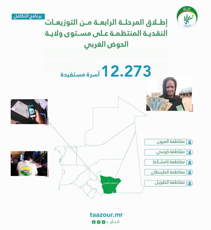 المنتظمة لبرنامج التكافل الذي تغطي توزيعاته النقدية كافة ولايات الوطن، وتمثل هذه المرحلة آخر مراحل التوزيعات النقدية لسنة 2022.وستدوم هذه التوزيعات أسبوعين وتشمل كافة مقاطعات الولاية، وذلك بغطاء مالي يصل إلى 270006000 أوقية قديمة، وتستفيد منه 12273 أسرة متعففة في ولاية الحوض الغربي.