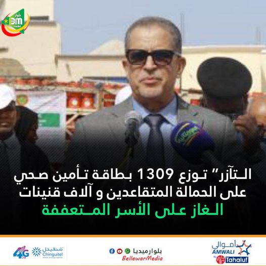 الحمالة المتقاعدين و10000 قنية غاز مع لوازمها من افران الطبخ على الأسر الهشة في بلديات نواكشوط الجنوبية الثلاث.ويتستفيد من الشق الأول من هذا التدخل الثاني من نوعه خلال أسبوعين على مستوى العاصمة 1309 مواطنين من الحمالين المتقاعدين وأسرهم من تأمين صحي يضمن لهم الحصول على كافة الخدمات الصحية وبشكل مجاني في جميع مستشفيات البلاد.