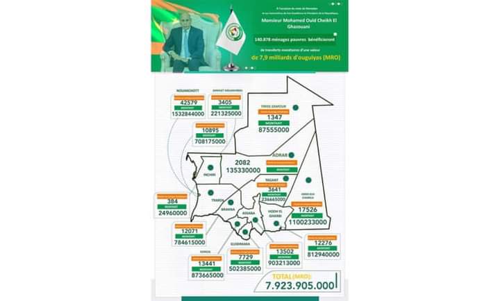 أطلقت المندوبية العامة للتضامن الوطني ومكافحة الاقصاء “التآزر” توزيعات مالية على عموم التراب الوطني يصل سقفها 792.390.500 أوقية جديدة تستفيد منها الأسر المتعففة على عموم التراب الوطني.