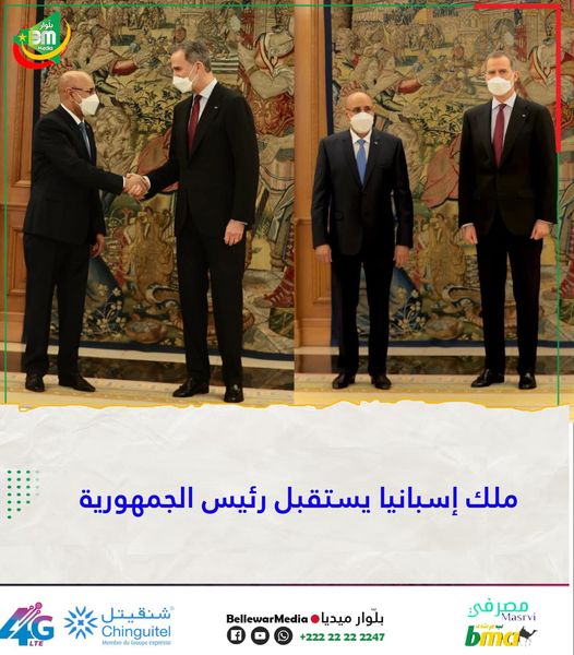 التقى فخامة رئيس الجمهورية السيد محمد ولد الشيخ الغزواني ظهر اليوم الخميس في قصر لازارزويلا ، العاهل الإسباني فيليب السادس في إطار الزيارة الرسمية التي يؤديها فخامته للمملكة والتي تدوم ثلاثة أيام