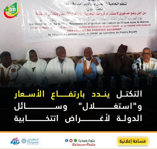 نظمت اتحادية تكتل القوى الديمقراطية بنواذيبو مساء اليوم السبت ، أمسية سياسية تحت عنوان : “من أجل وضع حد لاستنزاف ثروتنا البحرية… وارتفاع الأسعار وتفشي البطالة”.