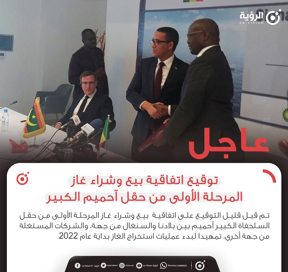 تم قبل قليل، التوقيع على اتفاقية بيع وشراء غاز المرحلة الأولى من مشروع السلحفاة الكبير آحميم بين بلادنا والسنغال من جهة والشركات المستغلة من جهة أخرى، تمهيدا لبدء عمليات استخراج الغاز بداية عام 2022.