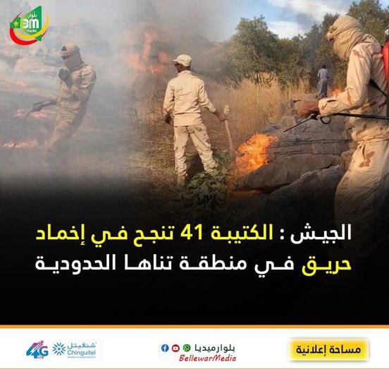 قال الجيش الموريتاني إن كتيبة تابعة له تمكنت من إخماد حريق كبير، شب في منطقة ميلي 11كلم من قرية تناها الحدودية، وذلك تلبية لطلب من السلطات