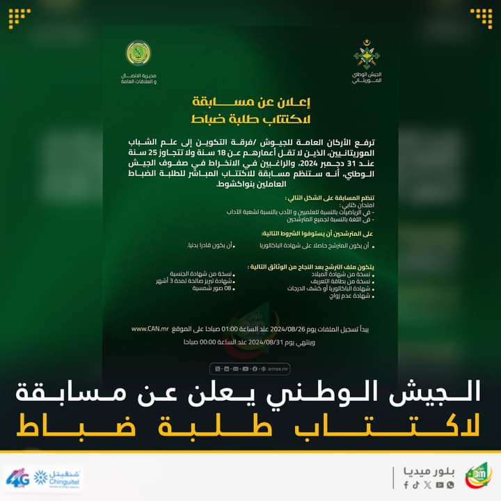 وأوضح الجيش أن المسابقة مفتوحة أمام الشباب الموريتانيين الذين لا تقل أعمارهم عن 18 سنة ولا تتجاوز 25 سنة عند 21 ديسمبر 2024. وفق بيان صادر عنه.