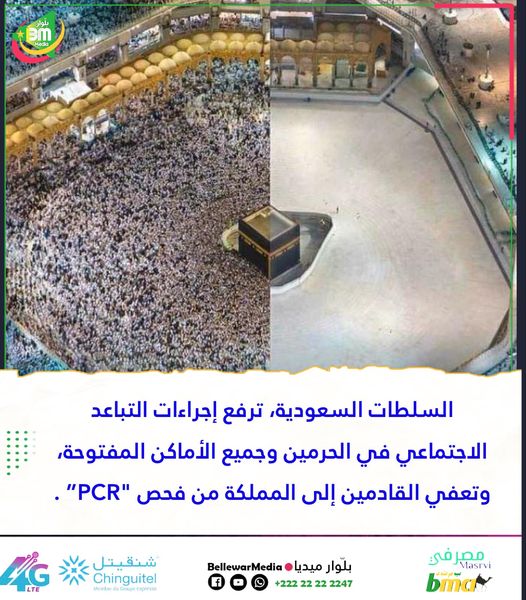 السلطات السعودية، ترفع إجراءات التباعد الاجتماعي في الحرمين وجميع الأماكن المفتوحة، وتعفي القادمين إلى المملكة من فحص “بي سي أر” .