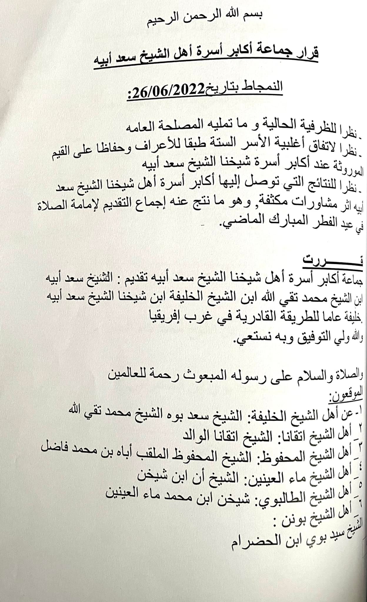 5- الترتيب للقاء يجمع الخلافة العامة للطريقة القادرية في غرب إفريقيا بجميع خلفاء مريدي شيخنا الشيخ سعد ابيه والفاعلين في أمور الطريقة… وذلك للتشاور من أجل تحديد أنجع السبل لتفعيل الدعوة الربانية لهذه الطريقة … على ان يعلن عن موعد هذا الإجتماع ومكانه في وقت لاحق إن شاء الله.
