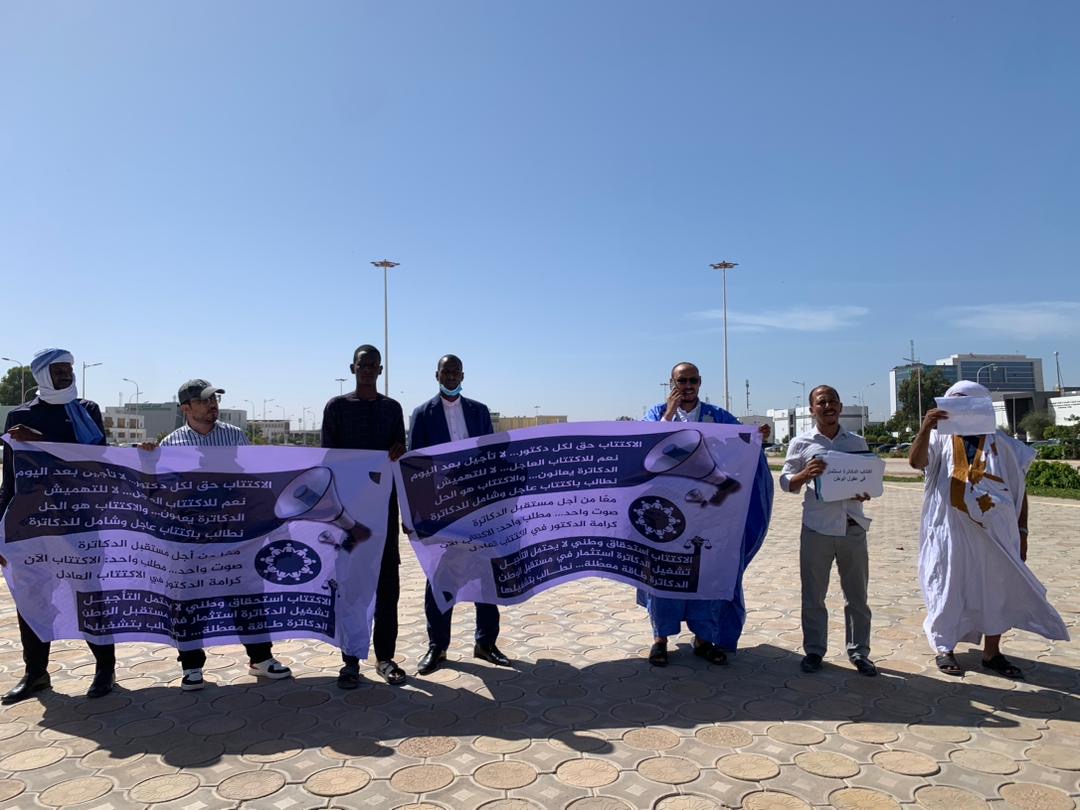 نظم عدد من الدكاترة المتعاونين مع مؤسسات التعليم العالي في موريتانيا وقفات سلمية أمام رئاسة الجمهورية ووزارة التعليم العالي والبحث العلمي، جددوا خلالها مطالبتهم بـ اكتتاب شامل وعادل وشفاف يضمن دمجهم في سلك التعليم العالي، بما يتناسب مع مؤهلاتهم الأكاديمية وخبراتهم البحثية.