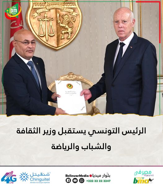 استقبل الرئيس التونسي قيس سعيّد، اليوم الجمعة الرئيس بقصر قرطاج، وزير الثقافة والشباب والرياضة ختار ولد الشيباني، الذي كان محمّلا برسالة خطية من رئيس الجمهورية محمد ولد الشيخ الغزواني