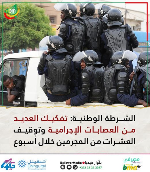 – توقيف عصابة يقودها مقيم أجنبي وتضم في عضويتها أجنبيا آخر وموريتانيا وهي المسؤولة عن عملية حي C بولاية نواكشوط الغربية والتي راح ضحيتها أحد مواطنينا بعد ان اقتحم عليه المجرم منزله وحاول قتله عن طريق إشعال النار فيه أولا ثم سدد إليه ضربات وطعنات لكنه تمكن من النجاة وتم إسعافه..