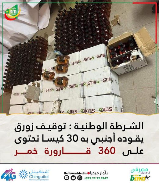 تمكنت فرقة الشرطة بمعبر جدر المحكن الحدودي بولاية الترارزه من توقيف زورق يقوده أجنبي به 30 كيسا تحتوى على 360 قارورة خمر كان بصدد إدخالها إلى مورتيانيا.