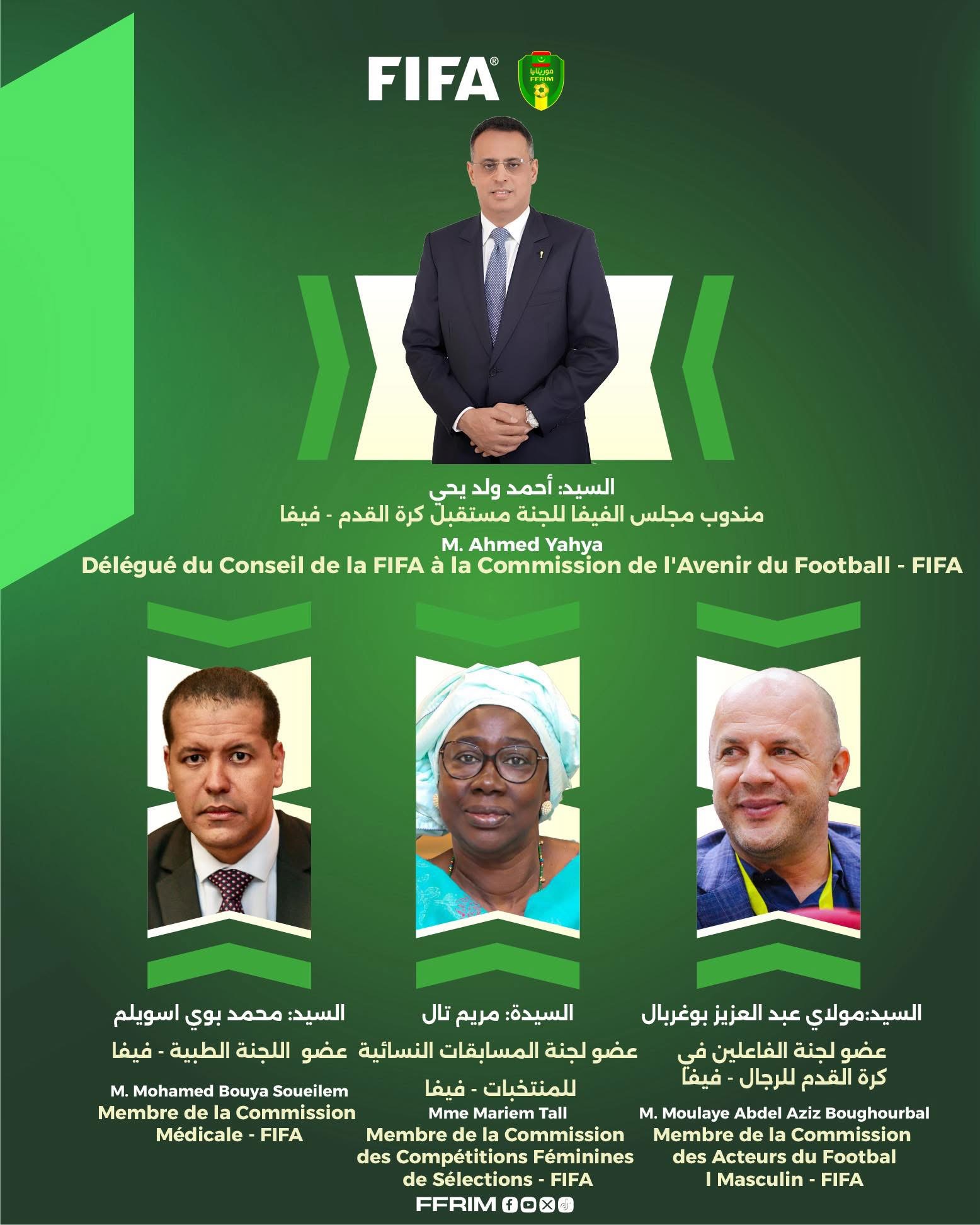 فقد اختار الفيفا عضو مجلسه التنفيذي ورئيس الاتحادية الموريتانية لكرة القدم، أحمد ولد يحي، مندوباً في لجنة مستقبل كرة القدم، وهي من أبرز اللجان الفنية التابعة للاتحاد.