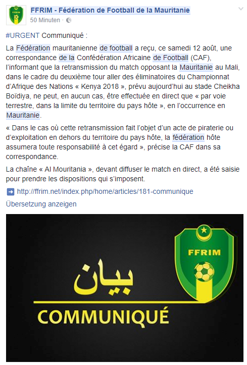 علنت الاتحادية الموريتانية لكرة القدم عبر صفحتها الرسمية علي الفيس بوك، أنها تلقت رسالة من الاتحاد الافريقي حول نقل لقاء المنتخب الوطني للمحليين .