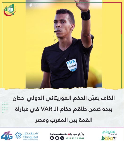 الكاف يعيّن الحكم الموريتاني الدولي الشاب دحان بيده ضمن طاقم حكام الـ VAR في مباراة القمة بين المغرب ومصر لحساب ربع نهائي كأس أفريقيا للأمم – الكاميرون 2021.