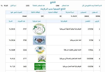 تصدرت الكونفدرالية الوطنية للشغيلة الموريتانية (CNTM) نتائج انتخابات التمثيلية النقابية بعد فرز 91% من الأصوات، بحصولها على 5757 صوتًا، أي ما يعادل 29.52% من إجمالي الأصوات المعبر عنها.