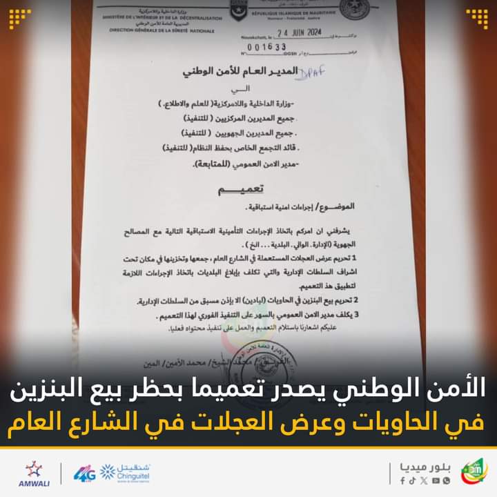 أصدر المدير العام للأمن الوطني محمد الشيخ محمد الأمين، اليوم الاثنين تعميما بحظر بيع البنزين في٧ الحاويات، وعرض العجلات المستعملة في الشارع العام.