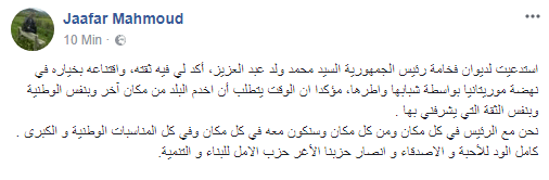 استدعيت لديوان فخامة رئيس الجمهورية السيد محمد ولد عبد العزيز، أكد لي فيه ثقته، واقتناعه بخياره في نهضة موريتانيا بواسطة شبابها واطرها، مؤكدا ان الوقت يتطلب أن اخدم البلد من مكان آخر وبنفس الوطنية وبنفس الثقة التي يشرفني بها .
