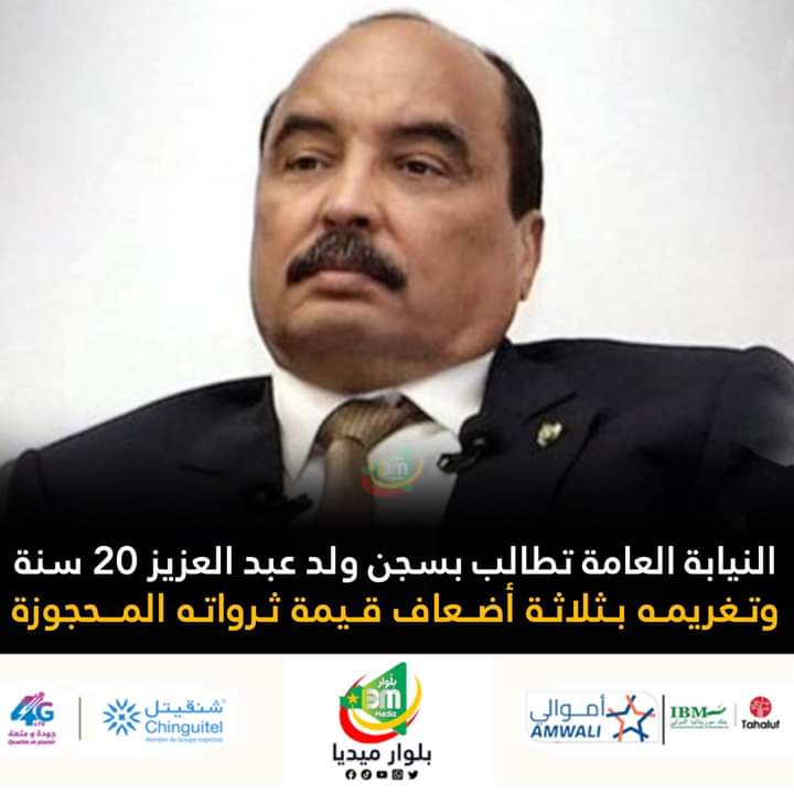 طالبت النيابة العامة بمحكمة ولاية نواكشوط الغربية بسجن الرئيس السابق محمد ولد عبد العزيز 20 سنة ومصادرة جميع ثرواته، وتغريمه بثلاثة أضعاف قيمة ثرواته المحجوزة.
