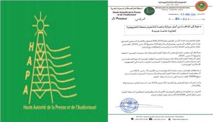 تعلن السلطة العليا للصحافة والسمعيات البصرية لكل المهتمين الدعوة للمنافسة من أجل حيازة رخصة تشغيل محطة تلفزيونية خصوصية تجارية جديدة في الجمهورية الإسلامية الموريتانية.