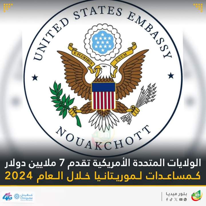 أعلنت سفارة الولايات المتحدة الأمريكية أن مكتب المساعدة الإنسانية التابع للوكالة الأمريكية للتنمية الدولية (USAID) قدم مبلغ 7 ملايين دولار كمساعدة مالية لموريتانيا، خلال العام 2024.