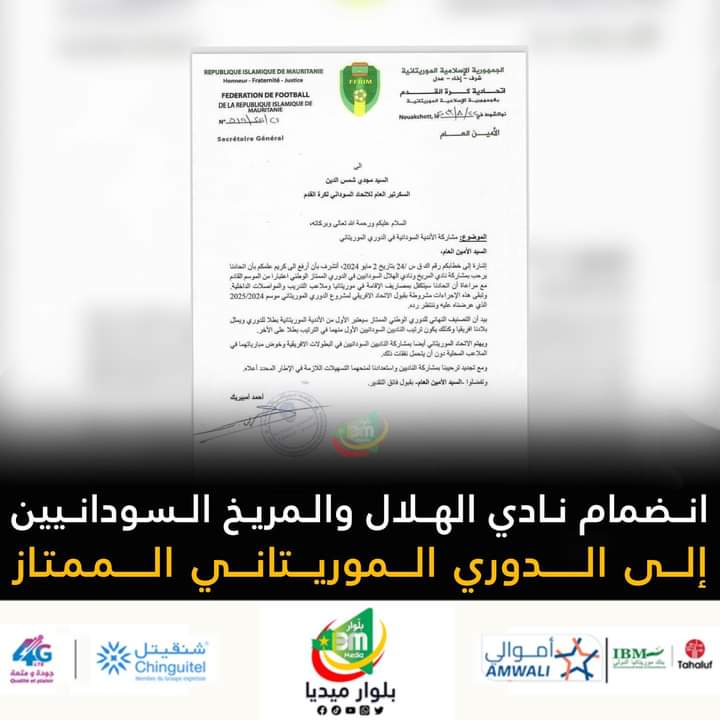 أعلن الاتحاد الموريتاني لكرة القدم موافقته على انضمام ناديا الهلال والمريخ السودانيان للعب في الدوري الموريتاني الممتاز الموسم المقبل.