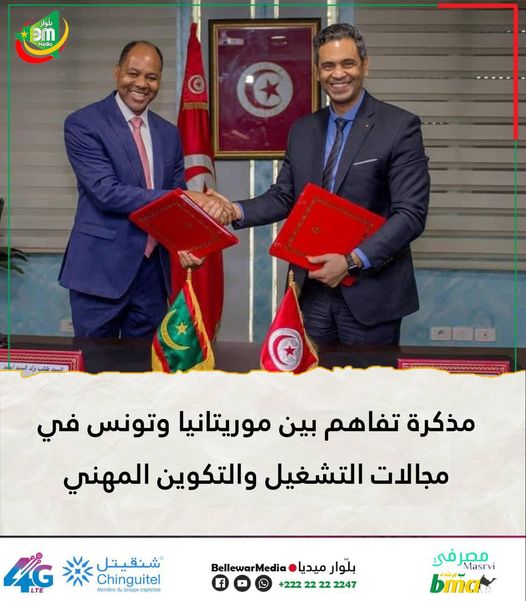 بإشراف من وزير التشغيل الطالب ولد سيدأحمد،رفقة نظيره التونسي السيد نصر الدين نصيبي ،تم أمس الإثنين توقيع مذكرة تفاهم بين موريتانيا وتونس لتبادل الخبرات في مجالات التشغيل والتكوين المهني .