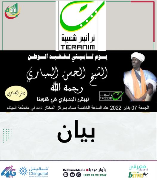 إننا في مركز ترانيم للفنون الشعبية، و بعد متابعتنا اليقظة للحالة الصحية للبلد و ما تشهده من ارتفاع عدد الإصابات اليومية لوباء كوفيد، فقد قررنا تأجيل النشاط التأبيني للمرحوم بإذن الله الشيخ الحسن البمباري الذي كان مقررا في 07/01/2022 بمركز المختار ولد داداه في مقاطعة الميناء إلى إشعار آخر ريثما تسمح الظروف الصحية بذلك ، و ذلك تفاديا للإنتشار السريع لهذا الوباء الفتاك.
