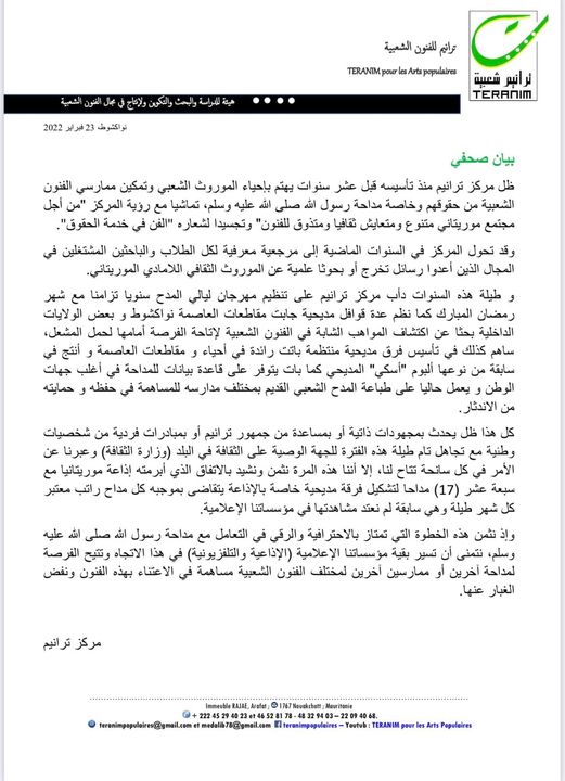 ظل مركز ترانيم منذ تأسيسه قبل عشر سنوات يهتم بإحياء الموروث الشعبي وتمكين ممارسي الفنون الشعبية من حقوقهم وخاصة مداحة رسول الله صلى الله عليه وسلم، تماشيا مع رؤية المركز “من أجل مجتمع موريتاني متنوع ومتعايش ثقافيا ومتذوق للفنون” وتجسيدا لشعاره “الفن في خدمة الحقوق”.