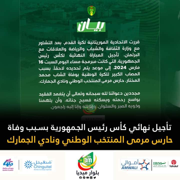 أعلنت الاتحادية الموريتانية لكرة القدم، أنه بالتشاور مع وزارة الثقافة والشباب والرياضة والعلاقات مع البرلمان، تم تأجيل المباراة النهائية لكأس رئيس الجمهورية، التي كانت مبرمجة مساء اليوم السبت، وذلك بسبب وفاة حارس مرمى المنتخب الوطني ونادي الجمارك الشاب محمد المختار.