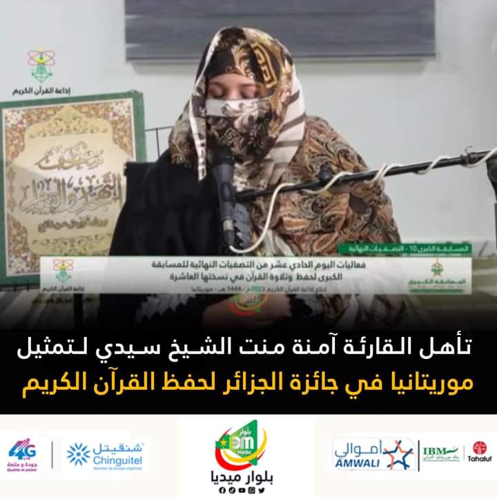 أعلن اليوم الجمعة عن تأهل القارئة الموريتانية آمنة منت الشيخ سيدي لنهائيات المسابقة الدولية لجائزة الجزائر لحفظ القرآن الكريم، في دورتها التاسعة.