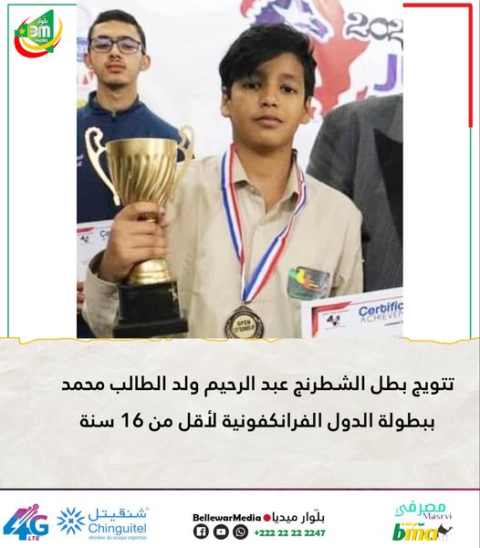 حصد بطل الشطرنج عبد الرحيم ولد الطالب محمد المرتبة الاولى في بطولة الدول الفرانكفونية التي اقيمت بالمغرب لأقل من 16 سنة .