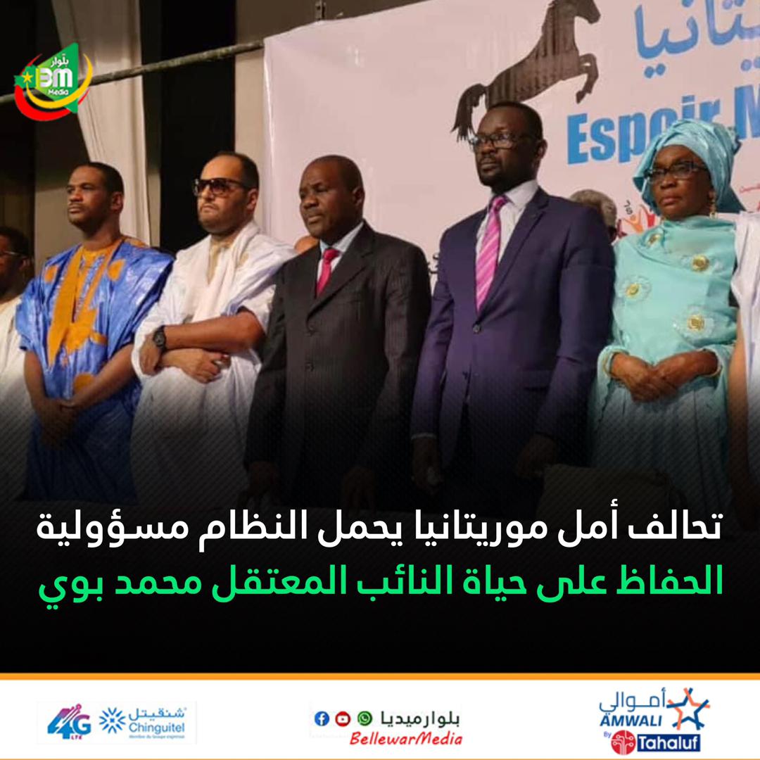 قال الناطق الرسمي باسم تحالف أمل موريتانيا محمد الأمين سيدي مولود، إن تحالف أمل موريتانيا يحمل النظام مسؤولية “أي شيء يحدث للنائب محمد بوي ولد الشيخ محمد فاضل، مضيفا أن الجهات التي اعتقلته تتحمل “مسؤولية الحفاظ على حياته وصحته.”