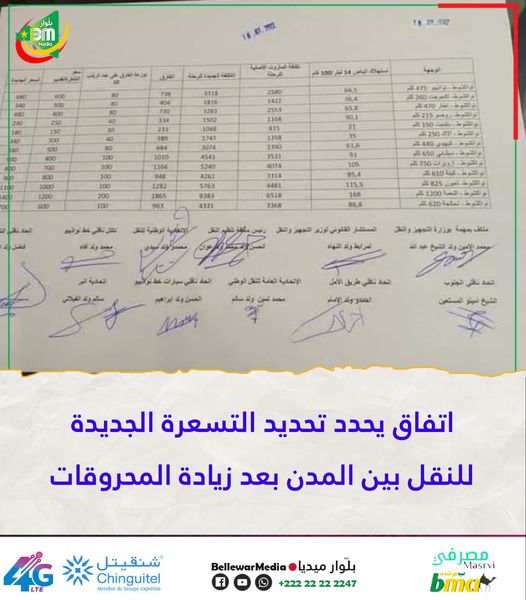 توصلت كل من وزارة التجهيز والنقل وسلطة تنظيم النقل واتحاديات النقل العاملة في موريتانيا، إلى اتفاق يحدد التسعرة الجديدة للنقل بين المدن، وذاك بعد الزيادة التي شهدتها مؤخرا أسعار المحروقات.